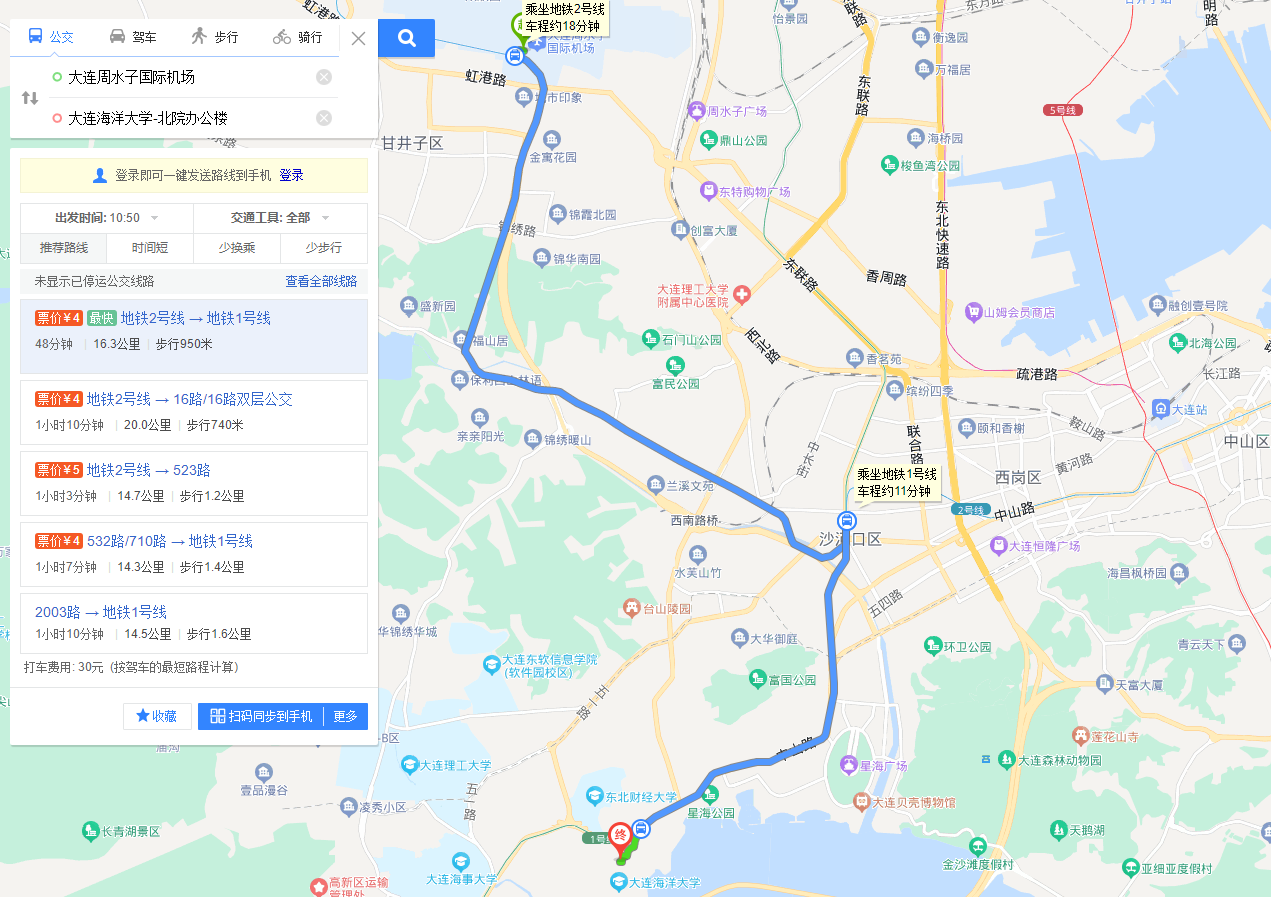 公交路线:从大连周水子国际机场出发,步行310米至地铁2号线机场站(海之韵方向)上车,西安路站下车换乘地铁1号线至黑石礁站(A口出)下车,步行630米至英国上市官网365北院办公楼。大致行驶路线如下图。